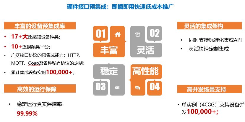 迄今乐鱼leyu公司已经预集成17+大泛感知设备种类,10+泛视频类平台,广泛接口协议的预集成能力涵盖了HTTP、MQTT、Coap及各种私有协议的定制,累计集成设备实例达100,000+。它还支持标准化集成API,可灵活快速地定制集成,通过构建规则引擎,实现了各设备间的联动应用,比如检测到违规停车,联动广播就会自动播报提醒,为社区管理服务赋能。